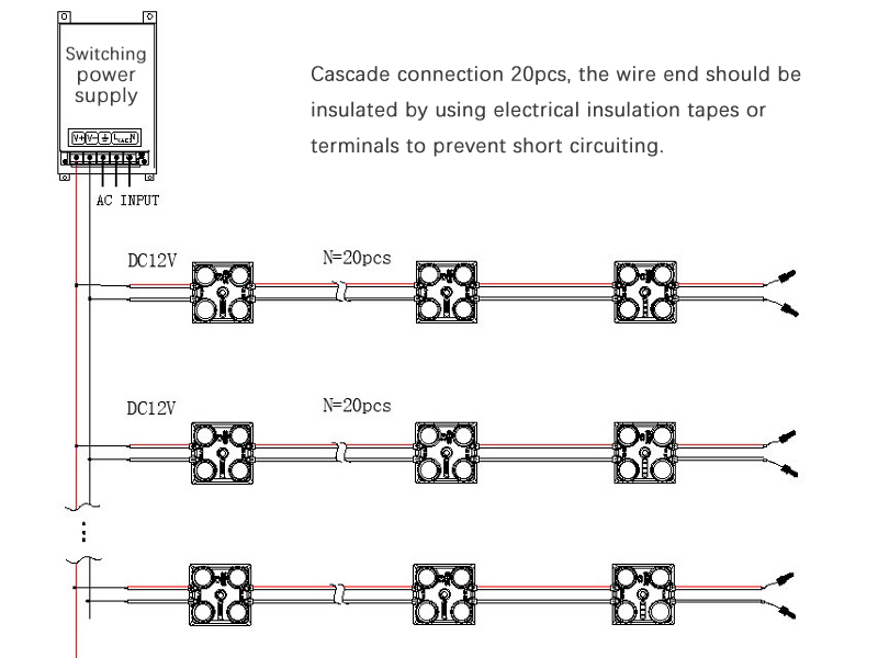 - Главный кабель питания: 2x1.5мм2. При необходимости удлинить линии светодиодных жестких стержней, необходимо использовать провод 0.75мм2/18# во избежание перегрузки питания, которая может привести к перегреву. Длина блока электропитания и питающего провода между лампочками не должна составлять более 3 метров;